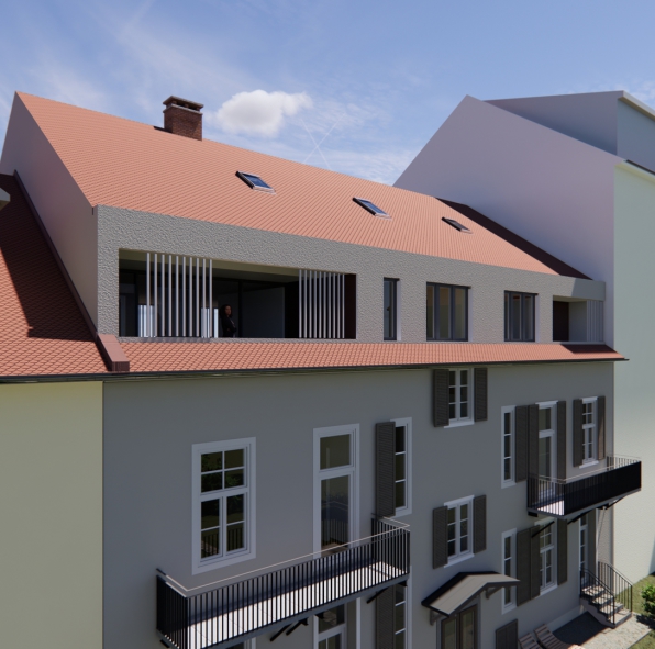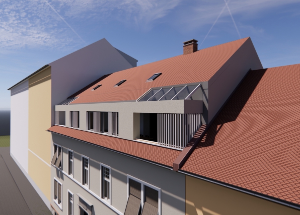 Es stellte sich durch Analyse der Nachbargebäude und in der 3D-Planung schnell heraus, dass die angestrebte Aufstockung auch optisch große Vorteile hätte, indem die zweigeschossig überragende